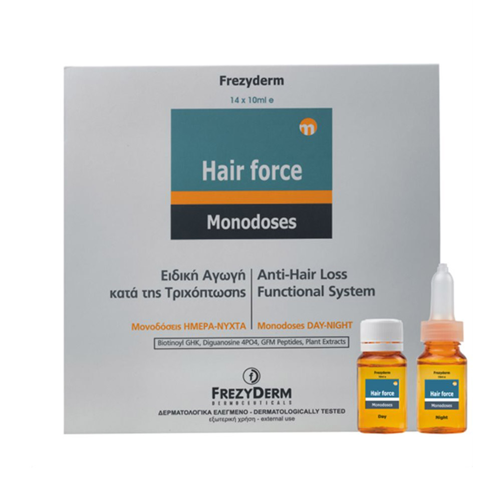 Οι αμπούλες Frezyderm Hair Force Monodose Day/ Night είναι μια ειδική αγωγή κατά της τριχόπτωσης, για άνδρες και γυναίκες. Συμβάλλουν στον έλεγχο της ορμονοεξαρτώμενης τριχόπτωσης, υποστηρίζοντας τη ρίζα της τρίχας στο τριχωτό. Παράλληλα, ενισχύουν την τριχοφυΐα, με κλινικές μελέτες να δείχνουν αύξηση των τριχών σε φάση ανάπτυξης κατά 46%. Κατάλληλες για αλωπεκία λόγω έλξης, ανδρογενετική αλωπεκία, χρόνια τριχόπτωση, καθώς και εποχική τριχόπτωση. Με ουδέτερο pH.